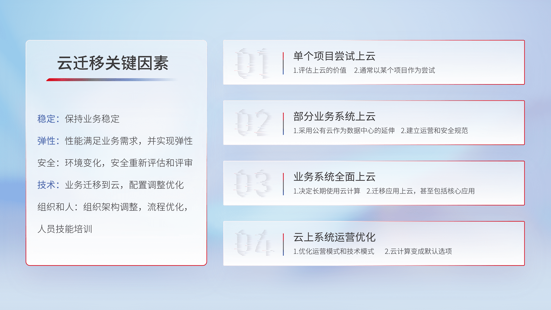 结合实际业务,,从规划设计、、云平台选型、、、云原生改造、、数据迁移、、集成交付,,,迁移全过程为客户识别最佳上云路径,,做好风险识别管理,,,设计网络架构、、身份权限、、安全审计合规、、、、操作审计、、、、日志审计、、、、监控告警策略、、、、多站点容灾设计等,,对云上基础设施进行整体规划,,,,提升IT治理水平,,,以满足弹性、、高可用、、、高性能的需求。。。。