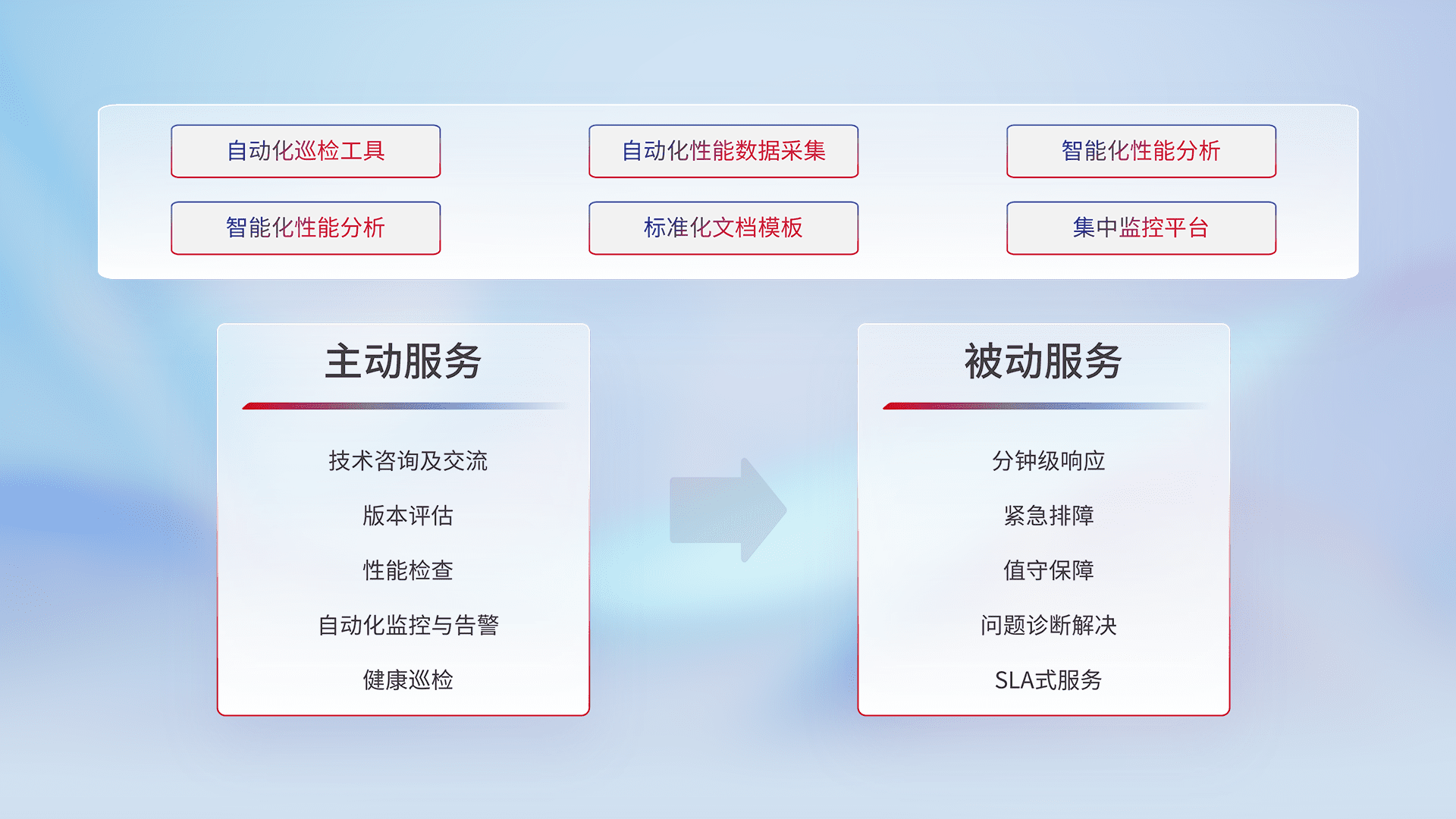 智能化工具和标准化文档,,,保障服务质量,,,,提供主动服务(包含技术咨询、、、版本评估、、、、性能检查、、自动化监控与告警、、、、健康巡检)和被动服务包含(分钟级响应、、、、紧急排障、、、值守保障、、、问题诊断解决、、、、SLA服务)。。。